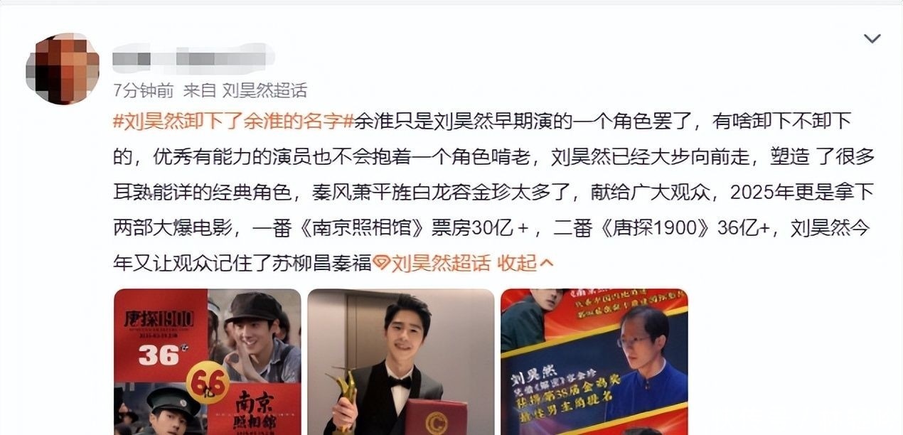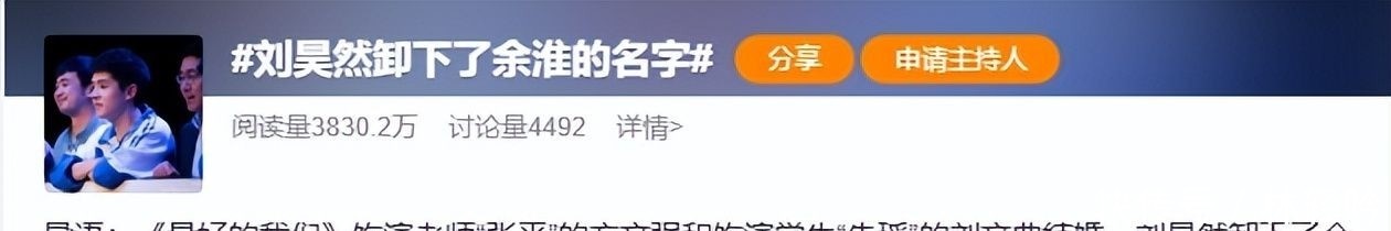 话题#刘昊然卸下了余淮的名字#在短短一百二十分钟内阅读量突破八千万。